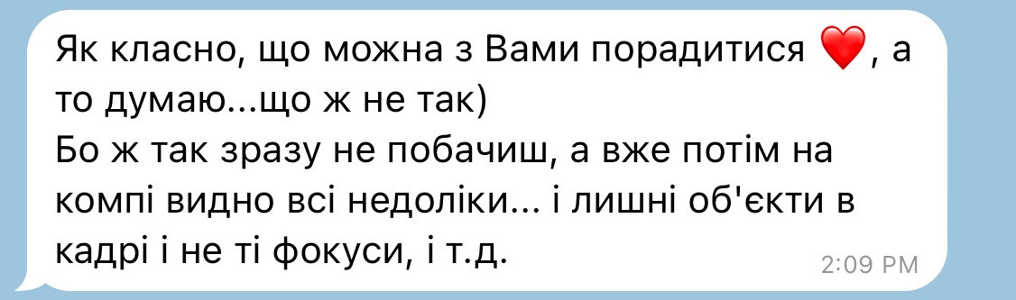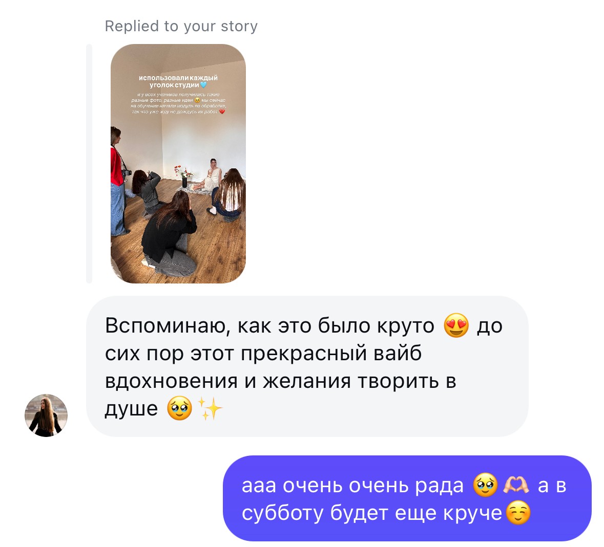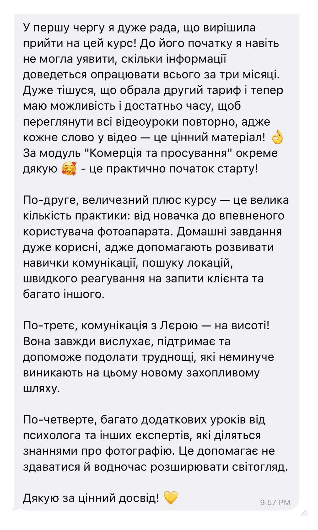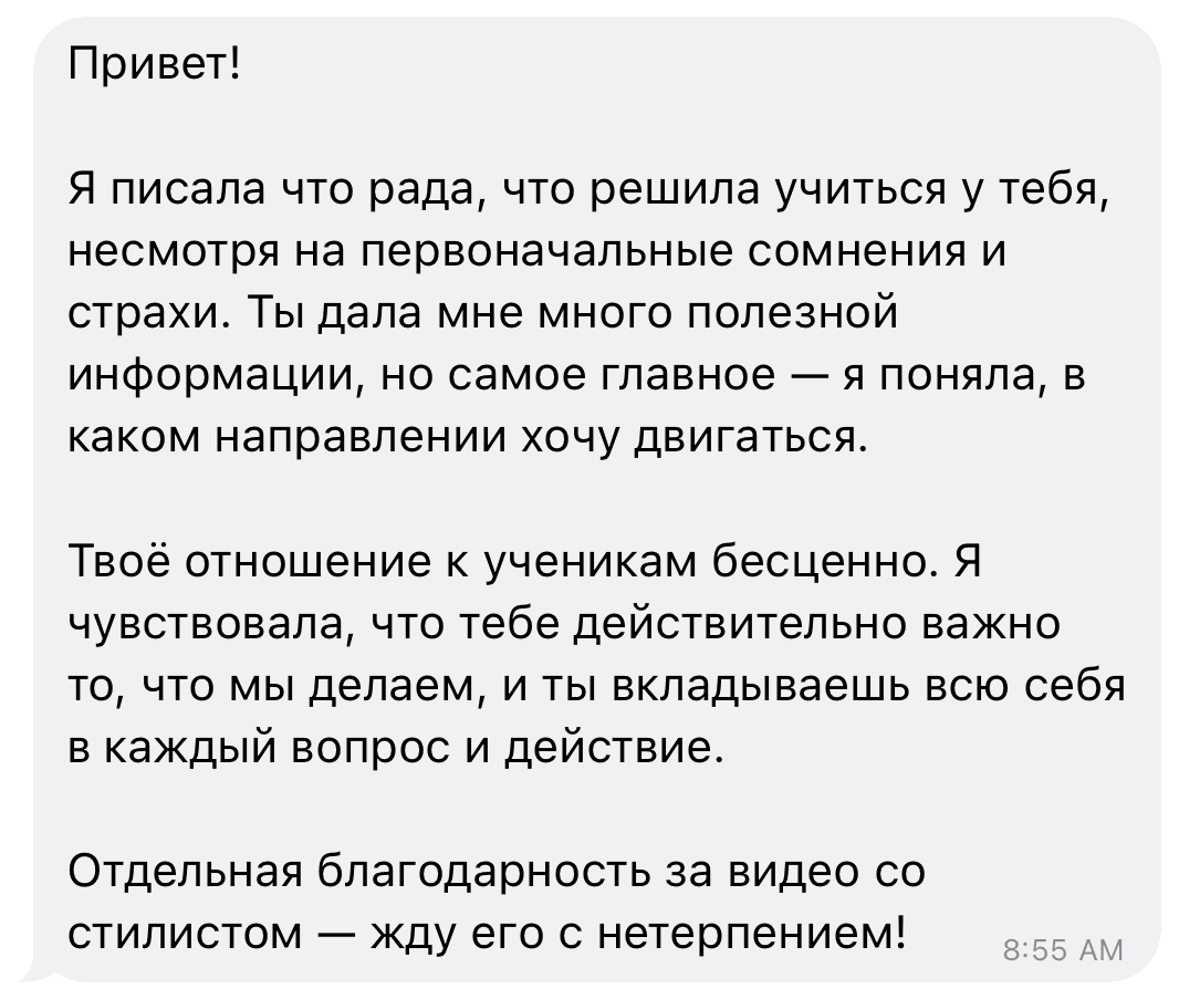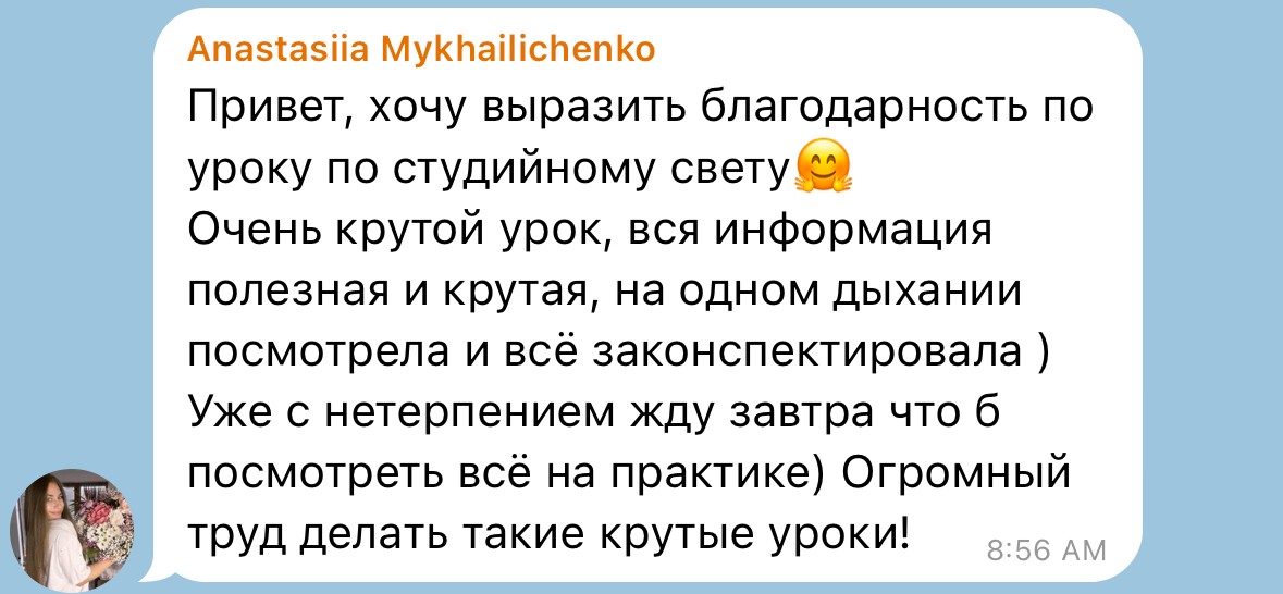 "Хотела еще отметить, что я шла на курс без особого понимания кто ты и что ты) без каких то рекомендаций - поэтому было много сомнений, но все оправдалось. Я проходила разного направления курсы, это пятые и вот он прямо один из двух лучших. Мне кажется тут есть прямо вся база, которая необходима, чтобы превратиться из человека, который может нажать только кнопку вкл на фотоаппарате - в фотографа. Плюс не просто более менее фотографа, а прямо качественного и современного. И конечно стоит отметить твое общение, очень легкое и поддерживающее. Это еще один огромный плюс курса, когда учитель не просто лектор, а вкладывается и вдохновляет ❤️"
