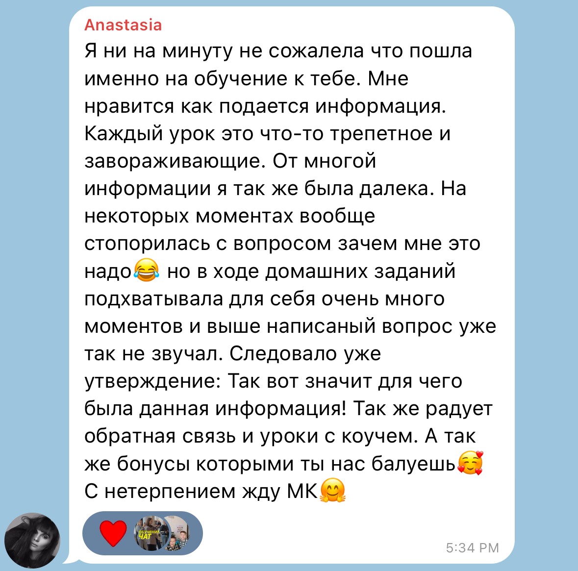 "Благодарю за обучение 💕 Ты очень помогла сменить вектор развития карьеры, если так можно сказать 😂 Кратко говоря - теорией и практикой помогла раскрыть таланты и обрести необходимые навыки 🎉 Запускай онлайн курс, успех с таким качественным материалом гарантирован!"